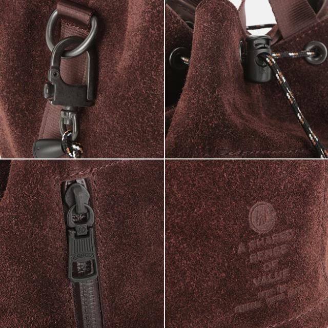 内装には 420デニールのブライトナイロン糸をオックス織りにした後、PVC(塩化ビニール)をコーティングした生地を採用。防水性・強度に優れています。ファスナーにはYKK社製の止水ジップ「アクアガードファスナー」を採用。防水性に優れているだけでなく、本体スエードとの異素材感とカラーマッチングによりデザインのアクセントになっています。細部にいたるまで配慮がなされたこのアイテムは“Made in JAPAN”。日本製です。