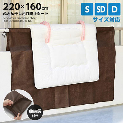 ベランダの汚れを気にせず干せる!ベランダでのふとん干し時、壁の汚れがふとんに付着するのを防ぐシート。ヒモを結んで固定できるので風で飛ばされにくい!留め位置調節OK。シングル敷き布団・掛け布団・ダブル敷き布団に対応。保管用収納袋付き。