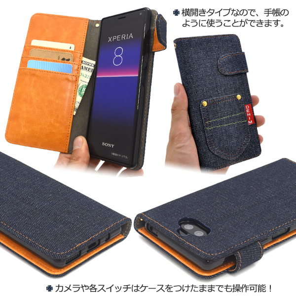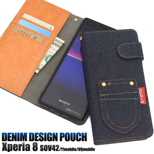 スマートフォンケース Xperia8 SOV42 au Y!mobile UQmobile用 手帳型 ポケットデニムデザイン カジュアル デニムケース お洒落 デニム 装着簡単 携帯ケース スマホカバー おしゃれ 保護カバー ボーイッシュ ボーイズライク