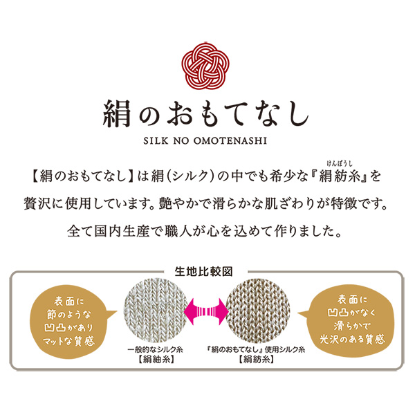 「絹のおもてなし」は絹(シルク)の中でも希少な「絹紡糸」を贅沢に使用しています。艶やかで滑らかな肌ざわりが特徴です。全て国内生産で職人が心を込めて作りました。