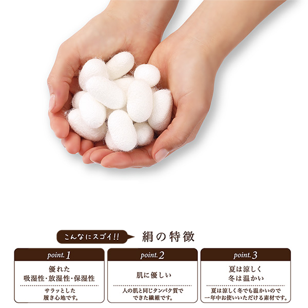 一般的なシルク商品は肌にあたる部分に化学繊維が含まれるものがほとんどですが、この商品は肌にあたる部分をシルクにすることで天然素材のぬくもりが感じられます。