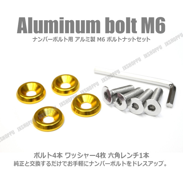 M6 25mm ナンバーボルトセット [ゴールド] アルミ製 ワッシャーx4 ボルトx4 六角レンチ付 軽自動車 普通車 車 汎用 イメチェン 送料無料 かわいい お手軽 エクステリア ドレスアップ おしゃれ カスタム 改造 外装 ねじ ネジ 工具付き SET 6角レンチ 工具 アルマイト 金属製