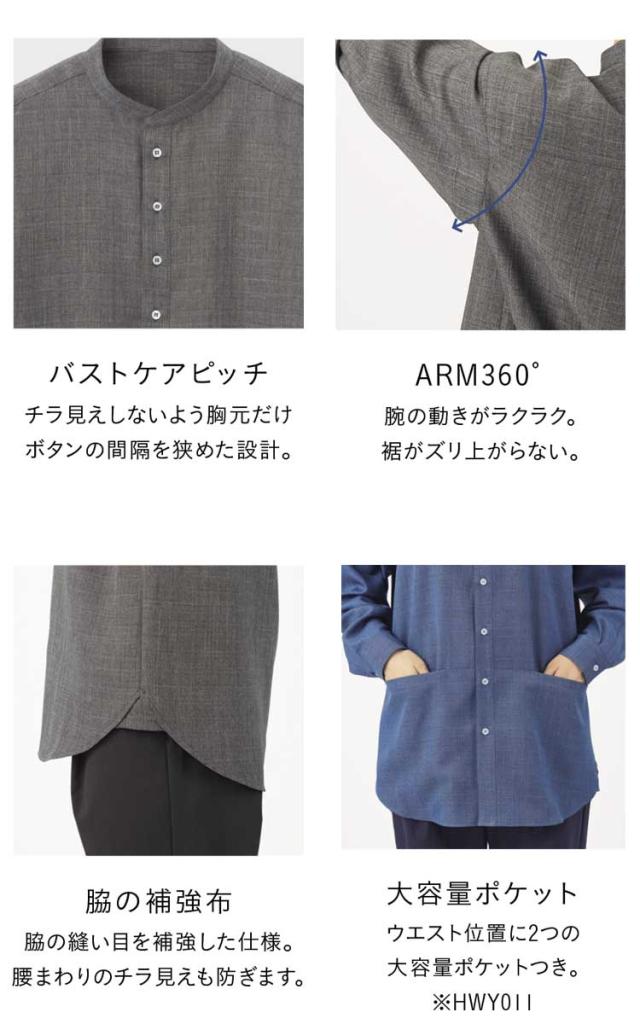 ●バストケアピッチ:チラ見えしないよう胸元だけボタンの間隔を狭めた設計。