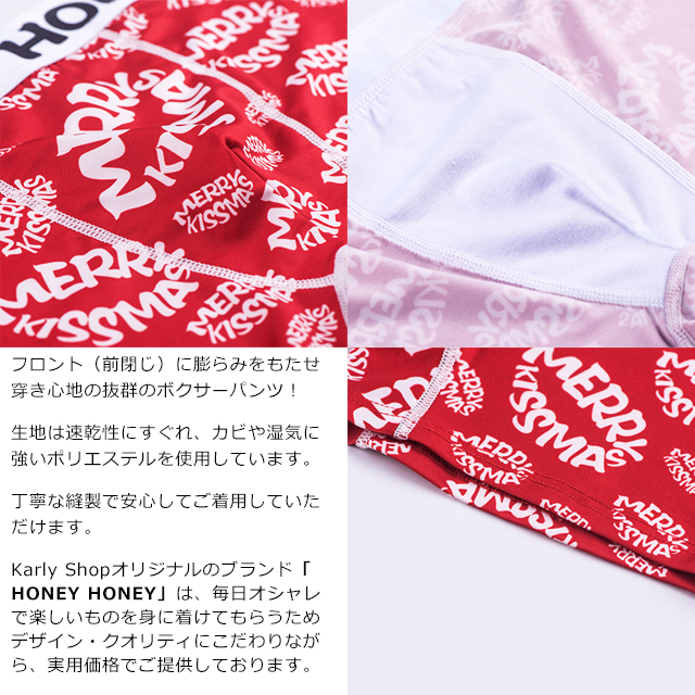 | 商品説明 | Karly Shop オリジナルブランド【 Honey Honey 】のボクサーパンツです。 「毎日オシャレで楽しく」がコンセプトの新しいブランド! デザイン・クオリティにはこだわり、企業努力により実用価格で提供しております。 フロントは、納まりが良いように膨らみを持たせた前閉じで快適です。 ギフト・プレゼントにもおススメです♪ |