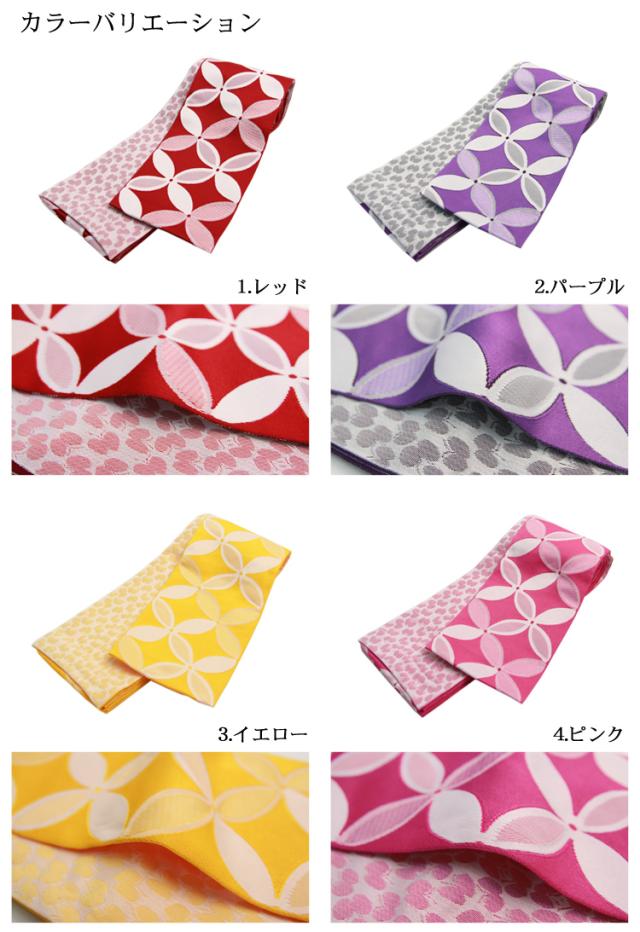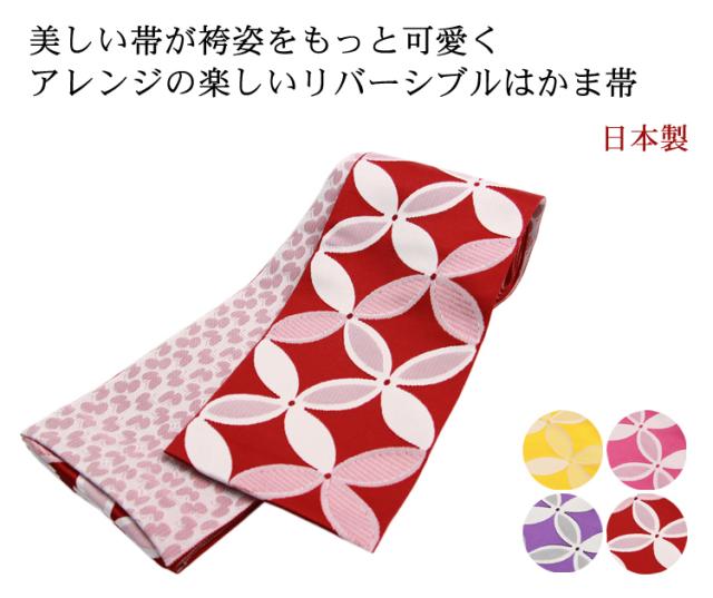 〔zu〕日本製 リバーシブルはかま帯「七宝柄と蝶」半幅帯 小袋帯 細帯 半巾帯 袴下帯 卒業式 袴用帯 着物 浴衣 小紋 パープル ピンク レッド イエロー 和柄 レトロ
