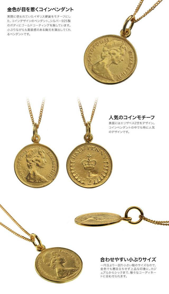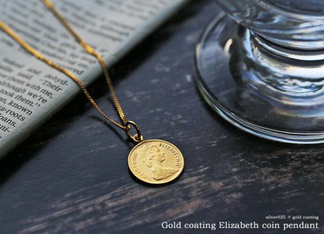 実際に使われていたイギリス硬貨をモチーフにした、コインデザインのペンダント。シルバー925製のボディにゴールドコーティングを施しています。エリザベス2世をデザインしたペンダントは、コインペンダントの中でも特に人気のデザインです。小ぶりながらも高級感のある胸元を演出してくれるペンダントです。
