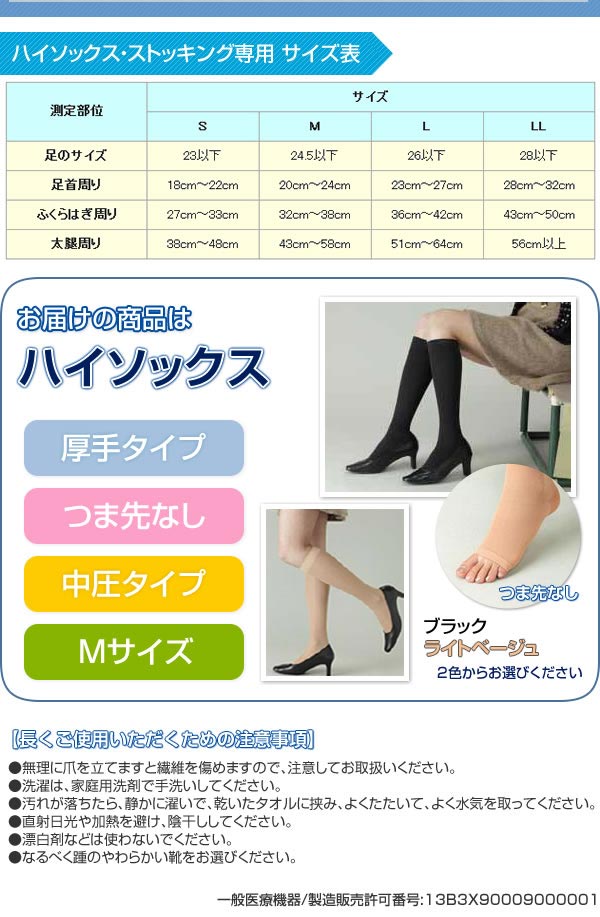 | 仕様 | 爪先タイプ:爪先なし 圧迫:中圧(30〜40mmHg/43〜53hPa) 一般医療機器/製造販売許可番号:13B3X90009000001 |