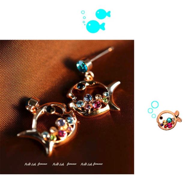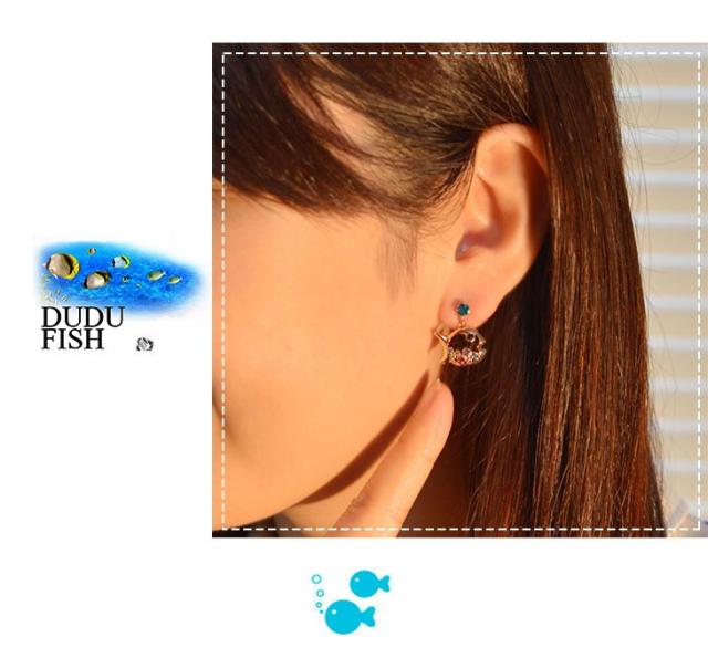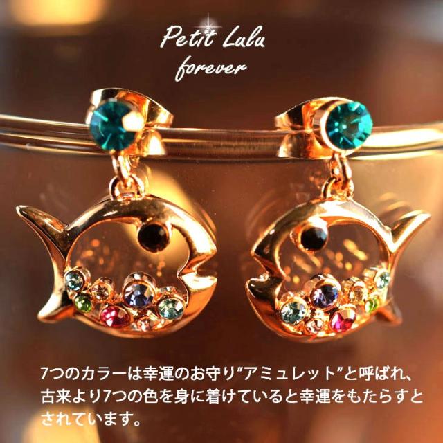 7色のスワロフスキーを身につけた可愛いお魚があなたの耳元をゆらゆら泳ぎます。ワンランク上の可愛さを演出できるピアスです。7つのカラーは幸運のお守り”アミュレット”と呼ばれ、古来より7つの色を身に着けていると幸運をもたらすとされています。毎日着けてもらいたい大切な方への贈り物にもオススメです。