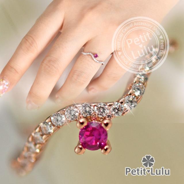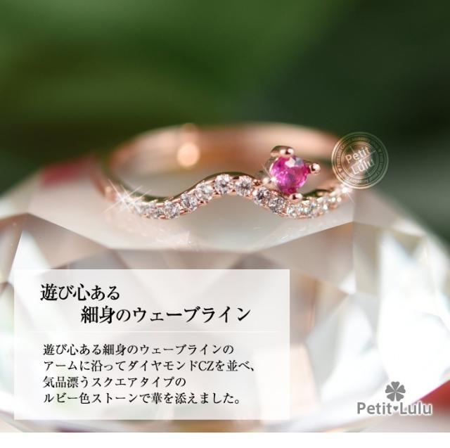 遊び心ある細身のウェーブラインのアームに沿ってダイヤモンドCZを並べ、気品漂うスクエアタイプのルビー色ストーンで華を添えました。印象的な色をさらに引き立てるデザインは上質感を醸し出すのはもちろんのこと、いつもの自分を格上げしてくれます。【レビューお約束でかわいい巾着プレゼント中】【素 材】:ダイヤモンドCZ 真鍮(K18コーティング) ※コーティングは通常より3倍厚くしております。【数 量】:1個【カラー】:ピンクゴールド【サイズ】:10号、13号、16号【付属品】:絵文字入りピローケース付き(プレゼントに最適) ※レビューを書くとかわいい巾着をプレゼントします。