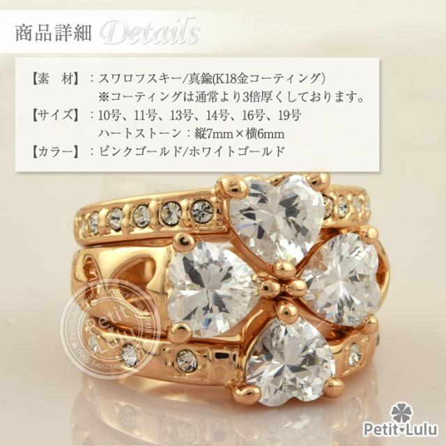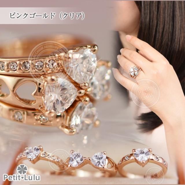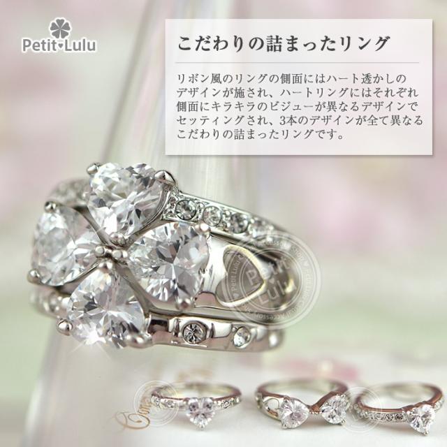 シンプルに1本だけつけても、ゴージャスに3本つけてもお洒落なアレンジ色々で楽しくなる3点セットリング!大粒のハートはブリリアンカットで美しくキュートな輝き・・・☆リボン風のリングの側面にはハート透かしのデザインが施され、ハートリングにはそれぞれ側面にキラキラのビジューが異なるデザインでセッティングされ、3本のデザインが全て異なるこだわりの詰まったリングです。4種類全て手に入れたら、組み合わせは貴方次第で無限大★1セットで最大6パターンの付け方が楽しめます♪金属アレルギーの方でも安心して身につけていただけます。【レビューお約束でかわいい巾着プレゼント中】【素 材】:スワロフスキー/真鍮(K18金コーティング) ※コーティングは通常より3倍厚くしております。【サイズ】:10号、11号、13号、14号、16号、19号【数 量】:3連1セット【カラー】:ピンクゴールド/ホワイトゴールド【付属品】:絵文字入りピローケース付き(プレゼントに最適) ※レビューを書くとかわいい巾着をプレゼントします。