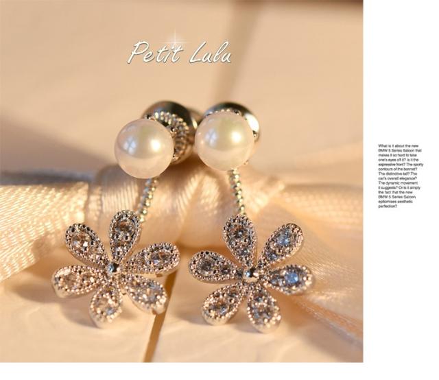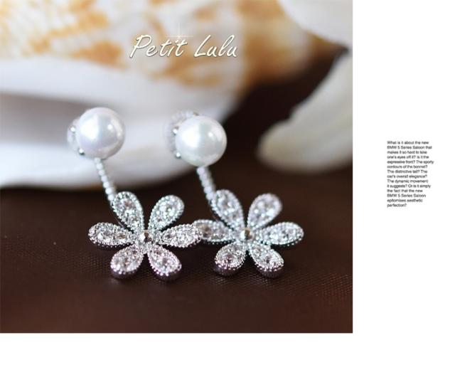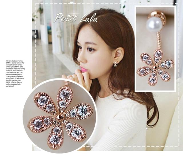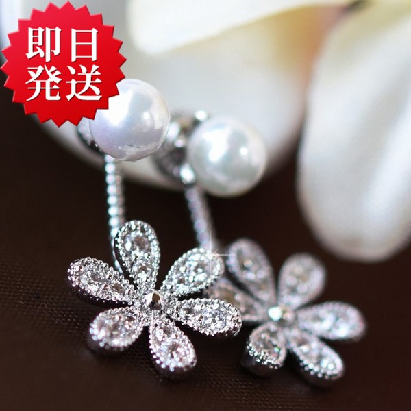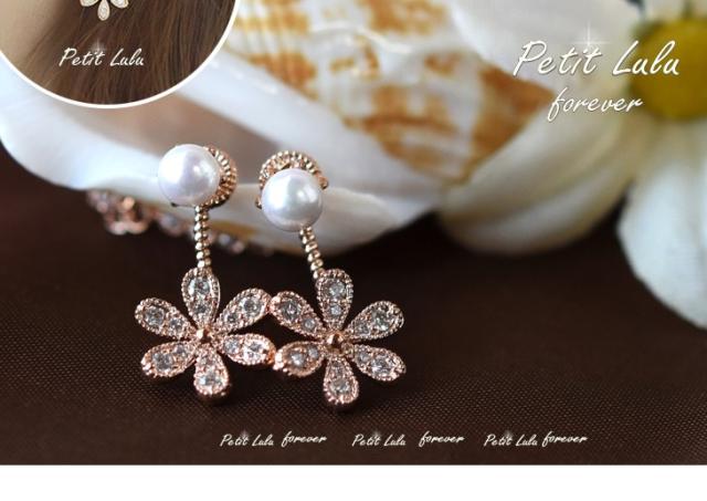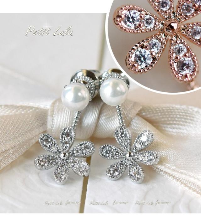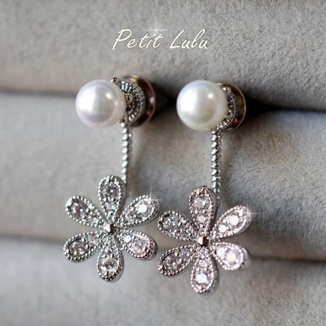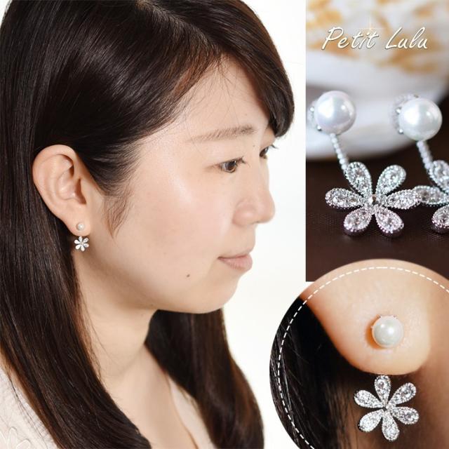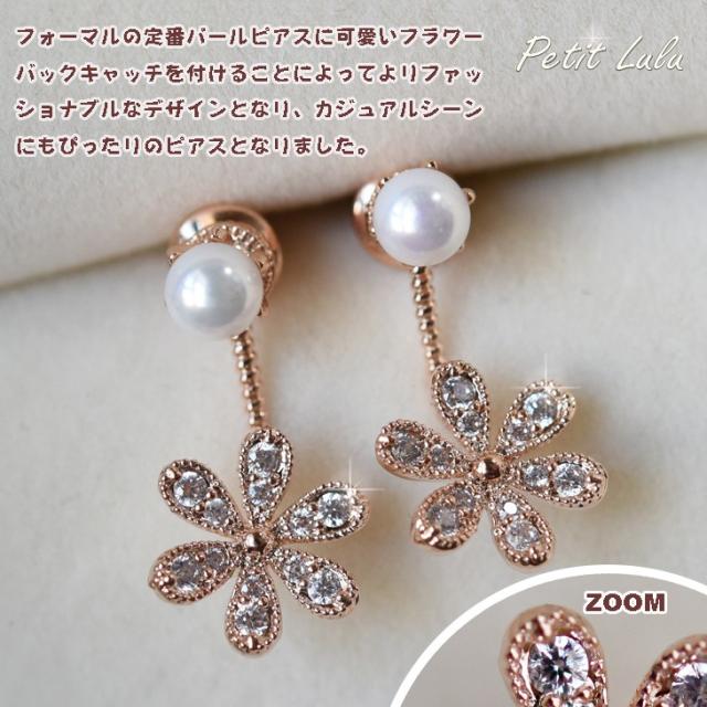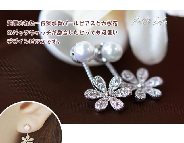 【手作り 数量限定販売】ピアス レディース AAA級 ダイヤモンドCZ 淡水パール 一粒 フラワー 六枚花 バックキャッチ フープ 揺れる 18K 18金RGP 925銀