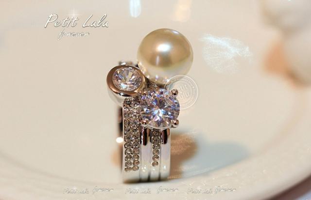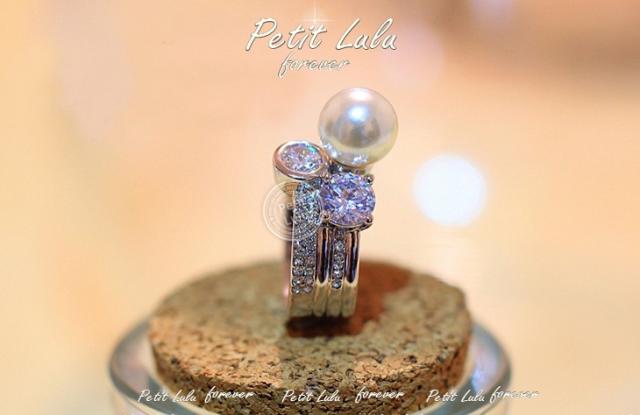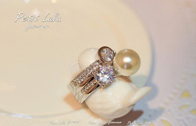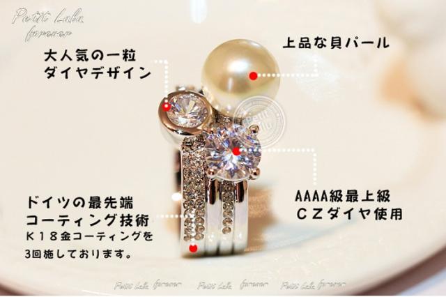 1本のリングに上品な大きめの貝パールを贅沢に使用し定番の4本爪のダイヤモンドCZ、可愛く縁どられたダイヤモンドCZと3つの顔を併せ持ちそれぞれが主張しながらもお互いを引き立てあう素敵な輝きを印象付けます。