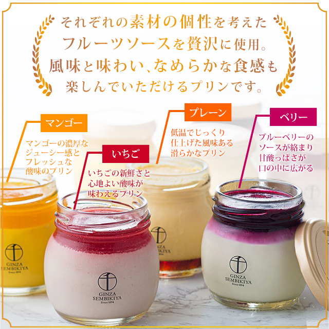 商品名 銀座千疋屋 銀座プリン詰合せ 容量 プレーン、いちごプリン、マンゴープリン、ベリーチーズ 各2個 計8個 ※1個約95g 原材料名 現物をご確認ください。 アレルギー特定原材料 卵・乳 加工地 日本 賞味期限 製造日から30日 保存方法 冷凍(-18℃以下)