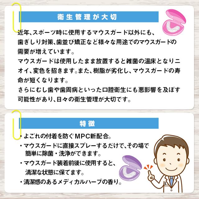 | 商品詳細 | ・よごれの付着を防ぐMPC新配合。 ・マウスガードに直接スプレーするだけで、その場で簡単に除菌・洗浄ができます。 ・マウスガード装着前後に使用すると、清潔な状態に保てます。 ・99%除菌が出来ます ※全ての菌を除菌するわけではありません。 ・清潔感のあるメディカルハーブの香り。 ・ナイトガード(歯ぎしり防止装置)や3DSトレー(ドラッグリテーナー)、いびき防止装置、リテーナー/スプリントなどにも使用できます。 |