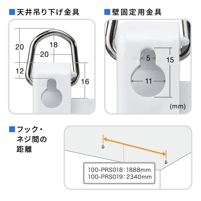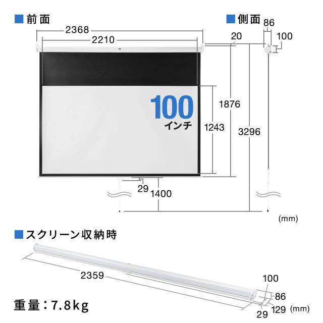 ■外寸(設置時):W2368×D86×最大H1876mm(スクリーン引き出し金具、吊り下げフック除く)■ケース収納サイズ:W2368×D86×H129mm(スクリーン引き出し金具含む、吊り下げフック除く)