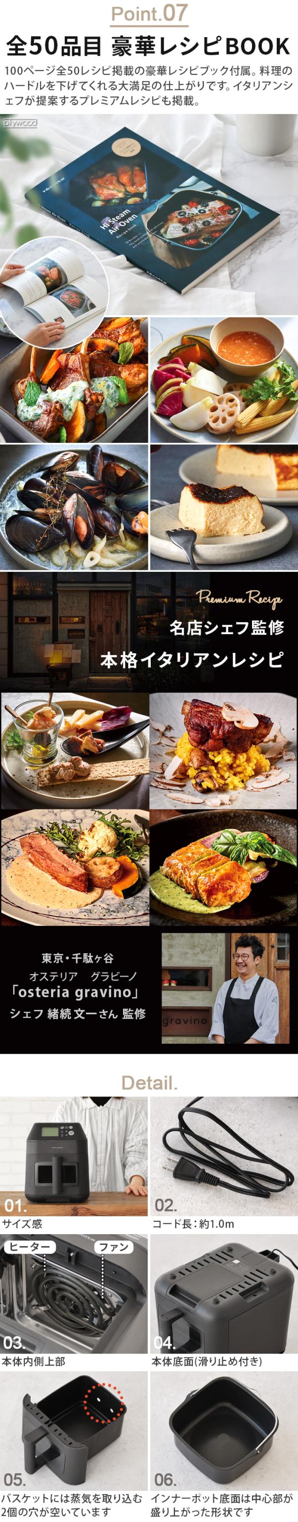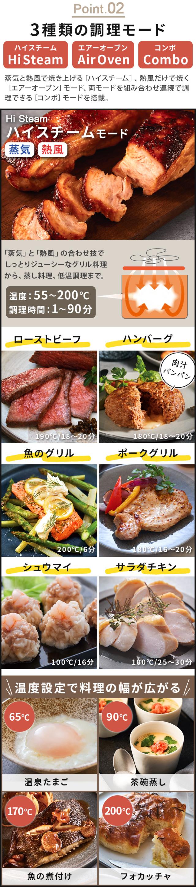 | 【Hi Steam】 温度設定:55~200℃(5℃単位)/タイマー:1〜90分(1分単位) 【Air Oven】 温度設定:80〜200℃(5℃単位)/タイマー:1〜90分(1分単位) 【combo】 Hi Steam→Air Oven または Air Oven→Hi Steam |