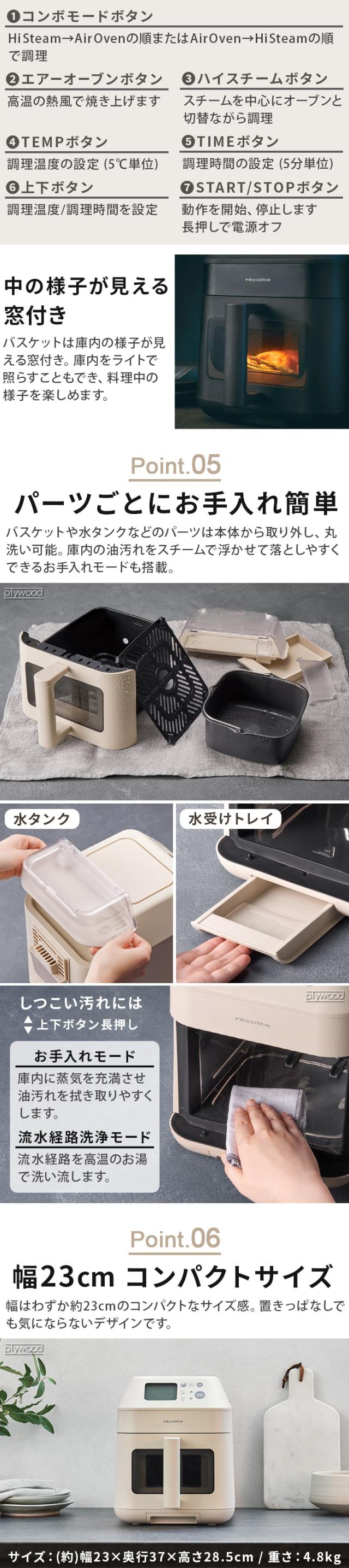 | ※2025年3月にモデル変更しました。 「recolte エアーオーブン RAO-1」の後継モデルです。旧モデルとは一部の仕様が異なります。 【変更箇所】 ・デザイン、サイズが変更されました。 ・ハイスチームモード、コンボモードが追加になりました。 ・インナーポットが付属になりました。 |