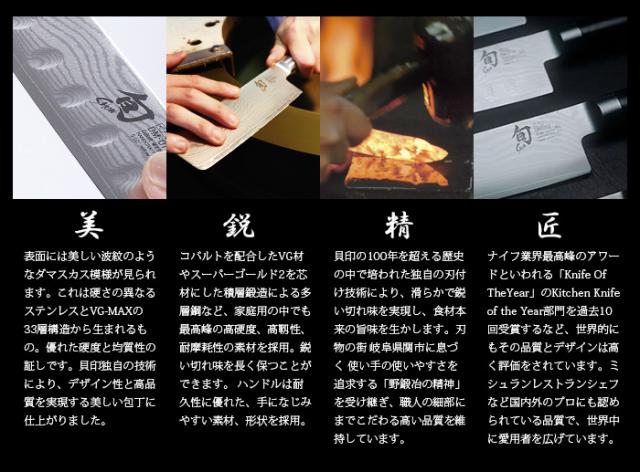 いつまでも続くおろしたて鋭い切れ味は、100年以上の歴史を誇る刃物メーカー、貝印が長年の刃物作りで培ってきた刃付けの技術と、高硬度・高炭素のVG-MAX材を芯材に採用することにより実現。