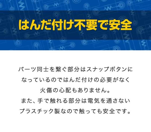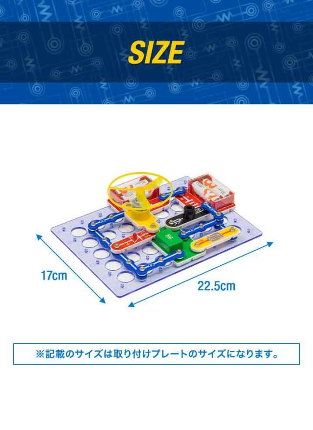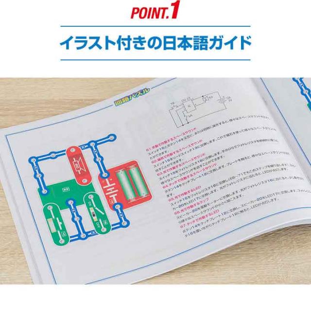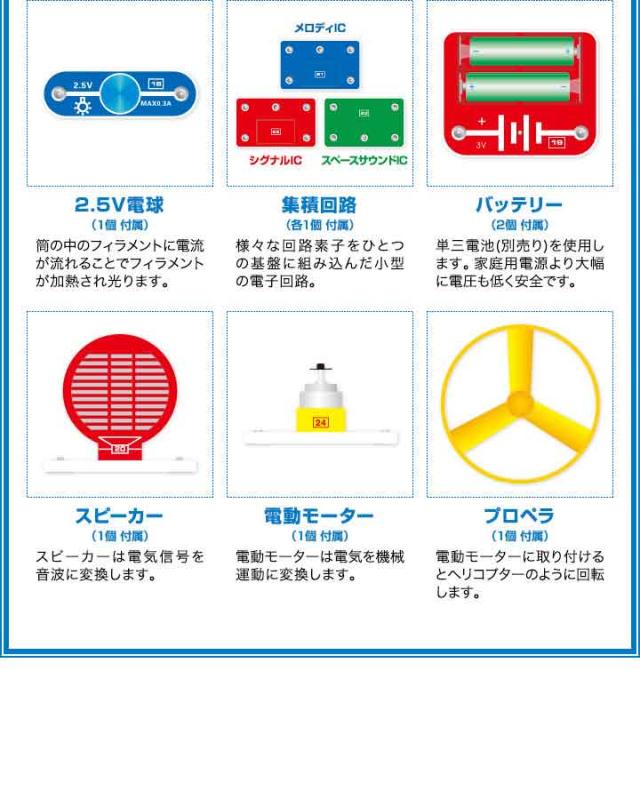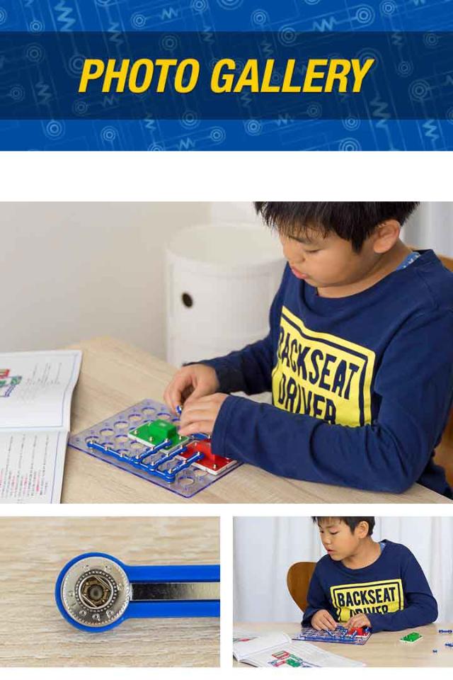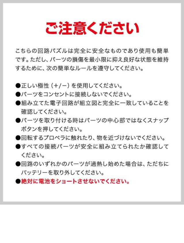 | 特記事項: こちらの回路パズルは完全に安全なものであり使用も簡単です。ただし、パーツの損傷を最小限に抑え良好な状態を維持するために、次の簡単なルールを遵守してください。 ●正しい極性(+/−)を使用してください。 ●パーツをコンセントに接続しないでください。 ●組み立てた電子回路が組立図と完全に一致していることを確認してください。 ●パーツを取り付ける時はパーツの中心部ではなくスナップボタンを押してください。 ●回転するプロペラに触れたり、物を近づけないでください。 ●すべての接続パーツが安全に組み立てられたか確認してください。 ●回路のいずれかのパーツが過熱し始めた場合は、ただちにバッテリーを取り外してください。 ●絶対に電池をショートさせないでください。 |
