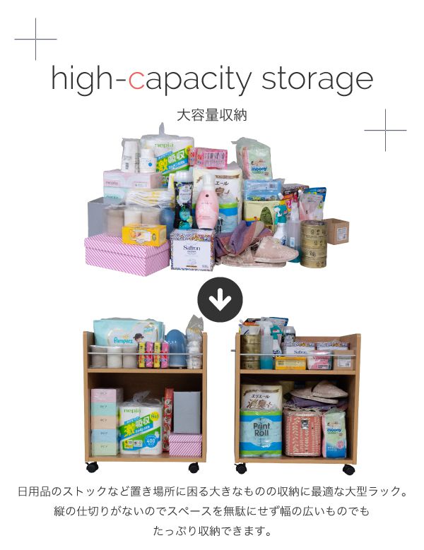 キャスター付きの便利なクローゼットラック2個組。取っ手はどちらにも取り付け可能なので、収納箇所の向きは左右入れ替えできます。幅が広いので収納場所に困る大きな日用品のストックにも最適。クローゼット内のスペースを有効活用するのでお部屋をすっきり片付けられます。