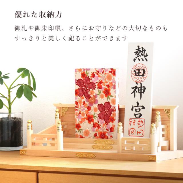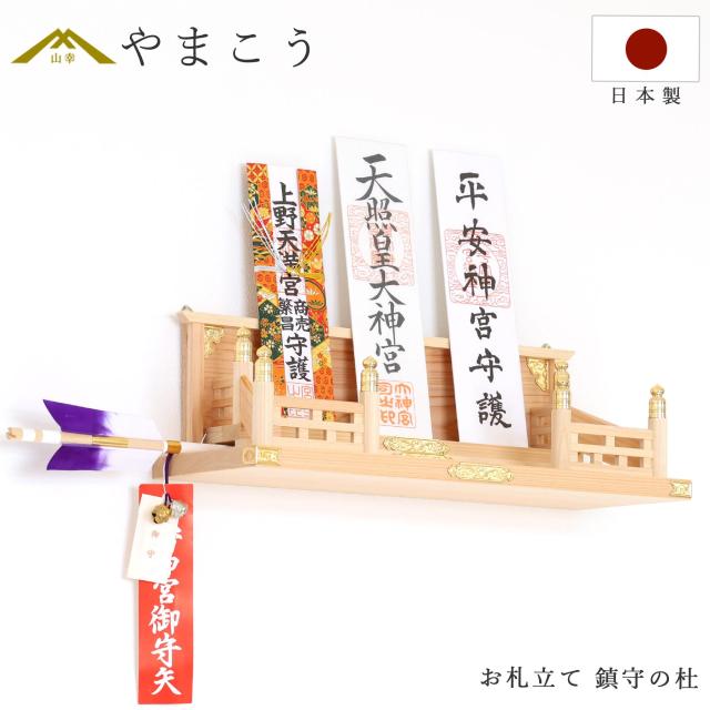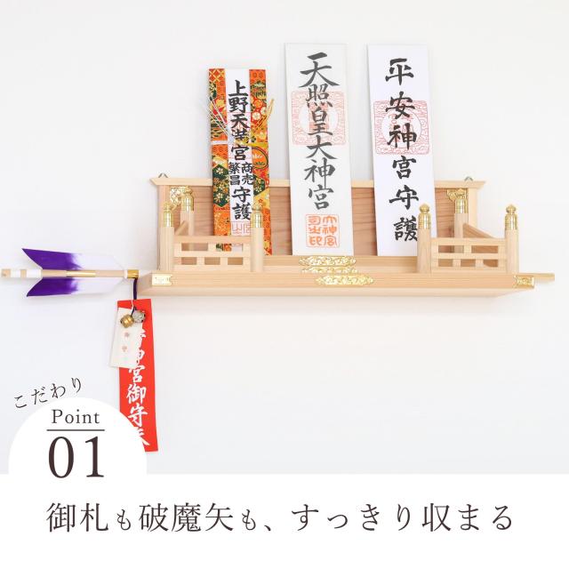 神棚は、神社とご家庭をつなぐ大切なアイコン。とても気軽に設置できる「お神札入れ」は、昨今の神棚の中でも主流です。「天照大御神」に始まり、それぞれの神社で頂くお神札が何枚も集まったら、神々のご神体は「神の棚」へ。「鎮守の杜」は見上げる高い所に置いても、壁に掛けても、お部屋のインテリアにすっと馴染む、しっかりと神棚。3枚までのお神札を美しく、飾ることができます。