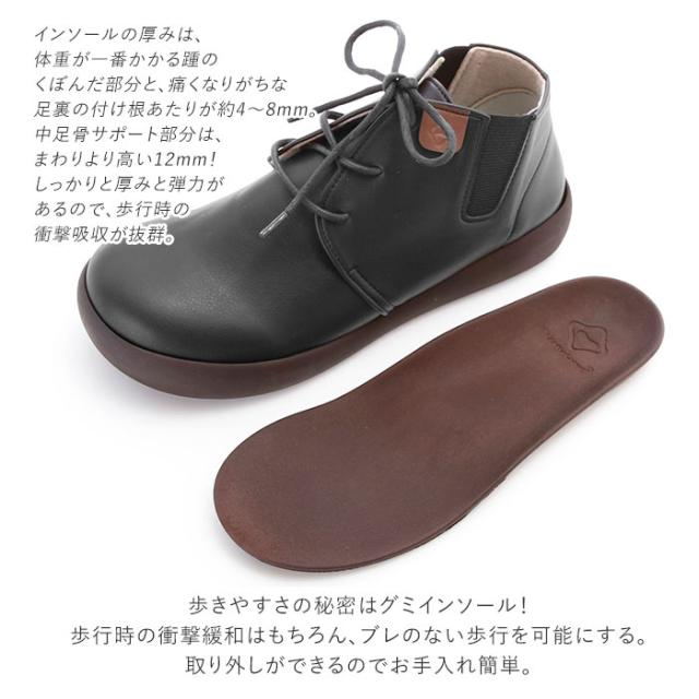 | 商品説明 | ・水、雪、氷面でも耐滑性ばっちり!Re:getA(リゲッタ)から高機能レースアップブーツが登場。 ・「下駄(Geta) をもう一度(Re:)」というコンセプトの元、2005年に大阪・生野区で生まれた、Re:getA(リゲッタ)。日本古来の機能的な履物である下駄を見直し、硬いアスファルトの上を歩く現代人の足にフィットするよう、人間工学に基づいたアイディアで再設計されて誕生したコンフォートシューズブランド。 ・アウトソール裏側に「ハイドロストッパー」を使い、濡れている道でも滑らず安心!ハイドロストッパーとは、ガラス繊維が路面に向かって重直配列されており、そのガラス繊維が剣山のように水膜を破って高い耐滑性を発揮する靴底。雨でも雪でも氷でも滑りにくい! ・履き口横にはロゴ。レースアップデザインで甲の高さに合わせて調節が可能。アッパーの両サイドにはゴムの切り替えが入ったサイドゴアデザインなので、ジッパーがなくても脱ぎ履きラクラク。 ・歩きやすさの秘密はグミインソール!ヒールカップは一番負担のかかる踵をふんわりと包み込む。歩行時の衝撃緩和はもちろん、ブレのない歩行を可能にする。内アーチサポートは、土踏まずの隙間を密着させることで足圧を分散。歩行の疲れを軽減。中足骨サポートは、足裏をしっかり持ち上げ、横アーチのスプリング力をサポート。その他、外アーチをしっかり支えて疲労を軽減する外アーチサポート、反り立った壁が、ぶつけやすいつま先をしっかり保護して、指やつめを安全にガードするトゥガードなど、足のことを一番に考えて作られたインソール。取り外しができるのでお手入れ簡単。 ・インソールの厚みは、体重が一番かかる踵のくぼんだ部分と、痛くなりがちな足裏の付け根あたりが約4〜8mm。中足骨サポート部分は、まわりより高い12mm!しっかりと厚みと弾力があるので、歩行時の衝撃吸収が抜群。 ・アッパーの内側はフェルト素材になっていて、肌あたりが優しく、冬でも足元をあったかく過ごせる。安定感があり、高すぎないアウトソールなので長時間歩いても大丈夫! |