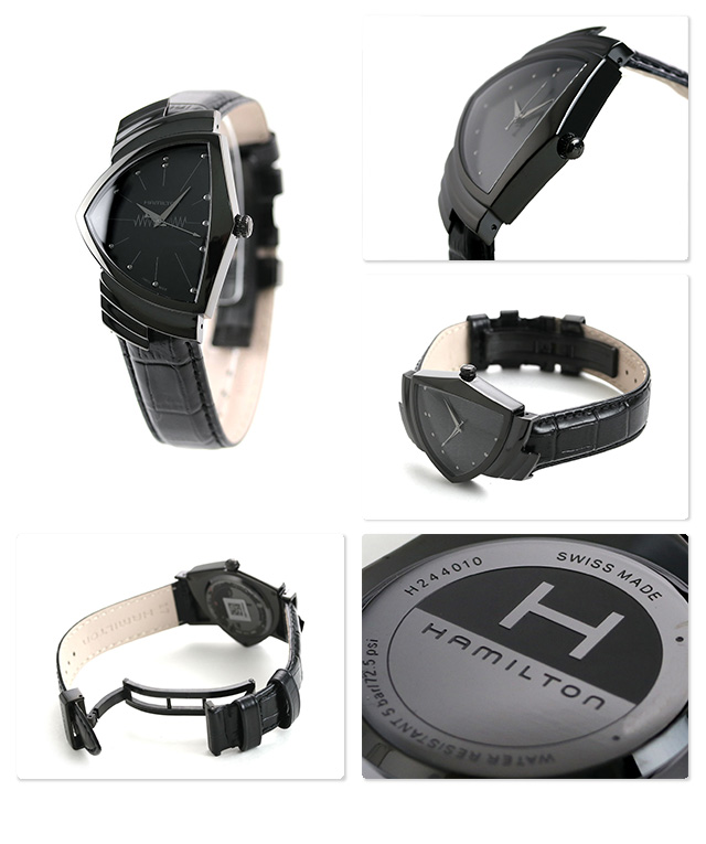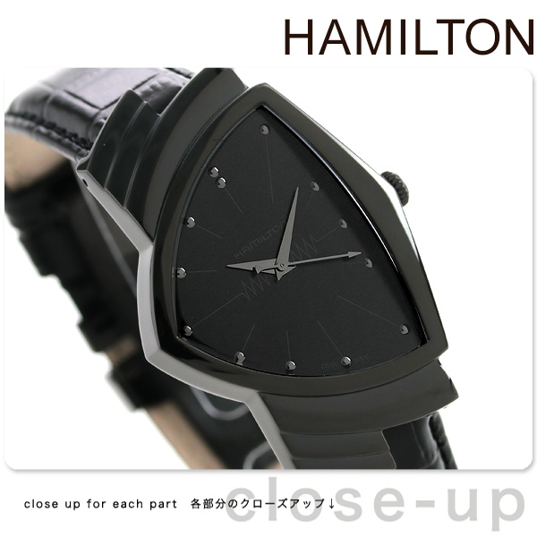 3年保証キャンペーン ハミルトン ベンチュラ クオーツ 32.5mm スイス製 クオーツ ペアウォッチ メンズ 腕時計 H24401731 HAMILTON VENTURA QUARTZ アナログ オールブラック 革ベルト ハミルトンはアメリカ発祥の老舗ブランドです。創業翌年に誕生した懐中時計ブロードウェイリミテッドは他の時計よりも正確に時を刻むことから鉄道用時計として採用され、その後も航空用時計や軍用時計として採用されるなど品質の高さと流行にながされない独自のデザインが世界中の人々に支持されています。時計史上の革命児ベンチュラ 常識とかけ離れた左右非対称のフォルムは保守的なデザインが主流であった時計業界に波紋を投げかけデザインウォッチの先駆けとして後世に大きな影響を及ぼしました。フルブラックモデル。唯一無二のアシンメトリーのケースにはブラックPVDコーティングが施されステルスルックに。大胆で型破りなそのデザインは自分のスタイルを貫く人のためのステートメントアイテムにふさわしい存在感を放ちます。ペアウォッチとしてのご使用もオススメ。