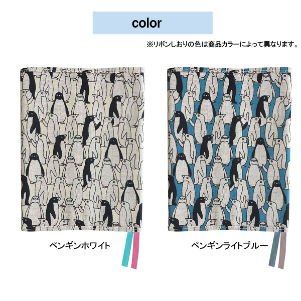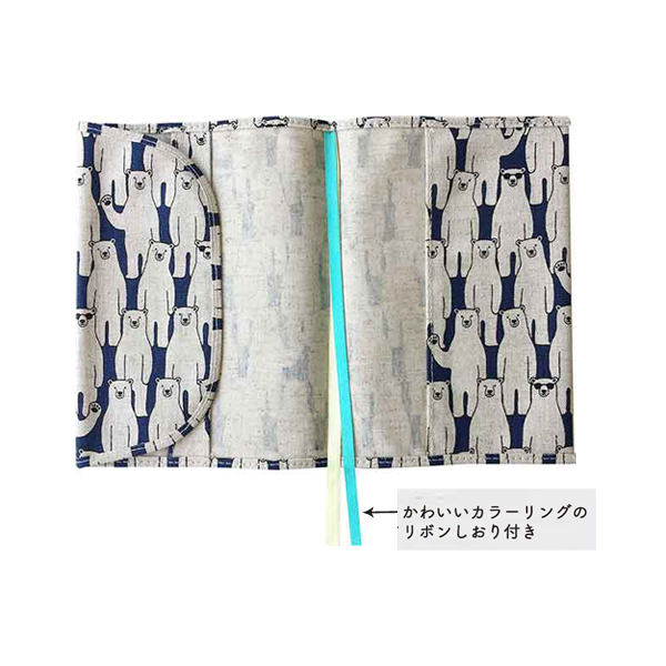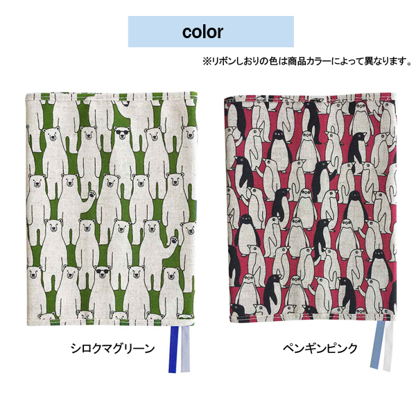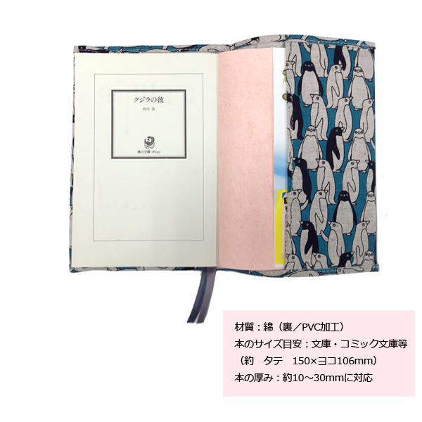 かわいい動物柄とリボンしおりが付いた文庫本サイズのブックカバー。綿素材に裏面PVC加工を施しているため丈夫で扱いやすく、本の厚みに合わせて調整できるのでぴったりフィットします。