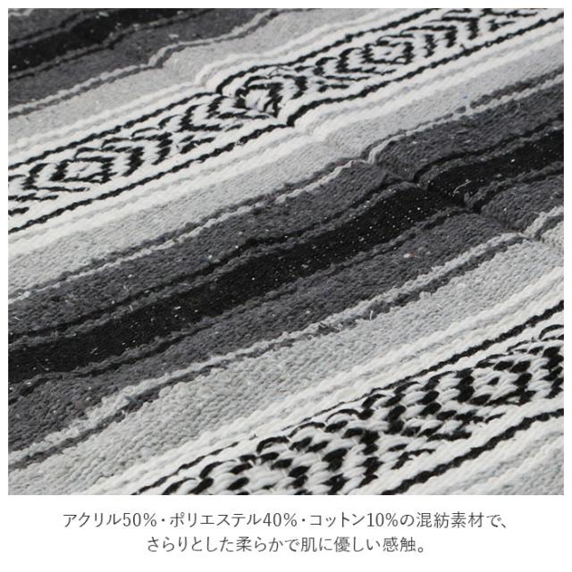 | 商品説明 | ・柔らかな肌触りと、色彩豊かなストライプ柄が印象的!ざっくりと織り込まれたメキシカンタイプのブランケット。 ・リビングのフローリングやダイニングテーブルの下にラグのように敷くだけで、お部屋が明るくなる!インテリアのワンポイントに! ・薄手タイプの生地なので、テーブルクロスやソファーに掛けたりすることで、お部屋の模様替えにも大活躍! ・アクリル50%・ポリエステル40%・コットン10%の混紡素材で、さらりとした柔らかで肌に優しい感触。肌寒い時にサッと膝に掛けるブランケットとして、ストレッチやヨガをする時の敷物など、使い方は自分次第♪ ・190cm×130cmの大判サイズで、薄手ながら目の詰まったしっかりした生地。ベッドカバーやアウトドアを楽しむ時の敷き物に活用してもオシャレ♪ ・原色カラーとブラックやグレーなどのダークカラーとを絶妙に組み合わせて、折りたたみ方によって多彩な表情を見せるグラデーションカラーが魅力的。豊富なカラーバリエーションの中から、お気に入りのカラーがきっと見つかる☆ |