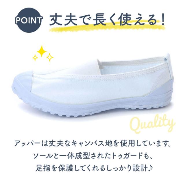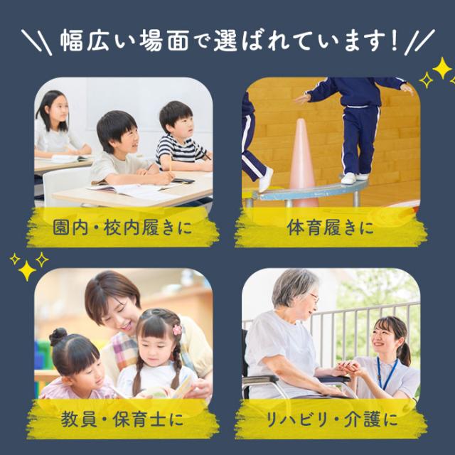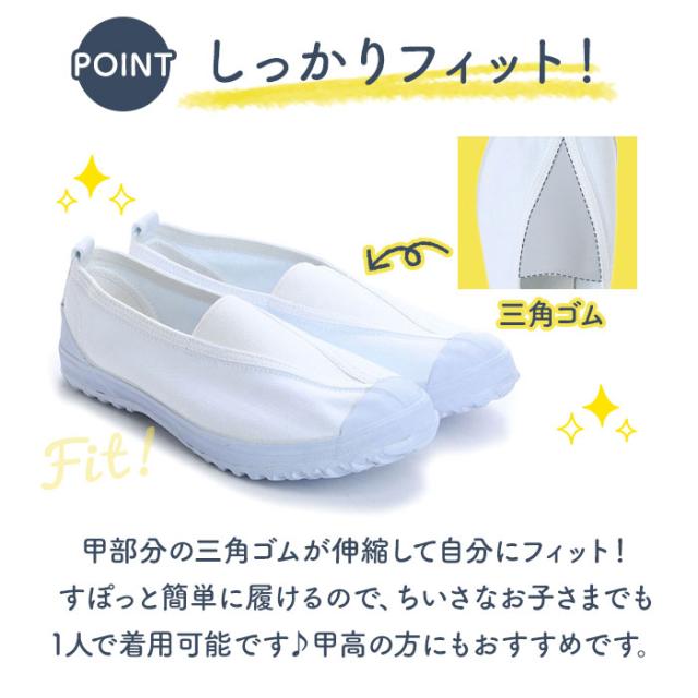 | 商品説明 | ・子供から大人まで使える、甲部分が三角ゴムタイプの上履き。サイズ:16cm〜25.5cm ・アッパーは丈夫なキャンバス地を使用。甲の中央部分がゴムになっているので、足をしっかりホールドしながら、脱ぎ履きもしやすい。 ・ソールと一体成型されたトゥガードが、足指を保護。 ・靴底はゴム製で溝がしっかりあるので、滑りにくい。 ・選べる5色展開。お子様の学校用、学校の先生やご年配の方のリハビリシューズ・介護シューズなど、幅広い場面で活躍できる上履き。 |
