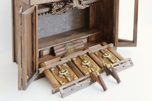 お社には、力強く優しく見守りくださる「鳳凰」が宿っています。天空を舞う不死鳥、永遠を表す象徴を細微な彫刻で表した、美しい神棚。手で彫られる細微彫刻は、神棚を工芸品のようなたたずまいに。