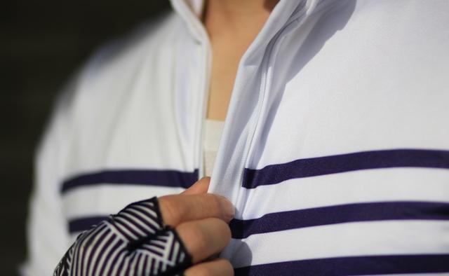 5本のネイビーのラインが清潔感を醸し、大人の休日ライドをおしゃれに演出します。