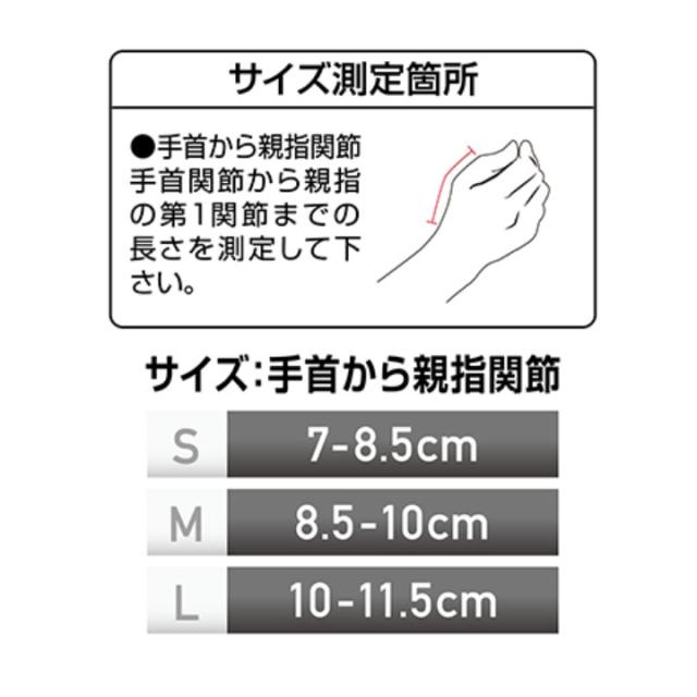 | サイズ(手首から親指関節/cm) | S 7〜8.5、M 8.5〜10、L 10〜11.5 |
