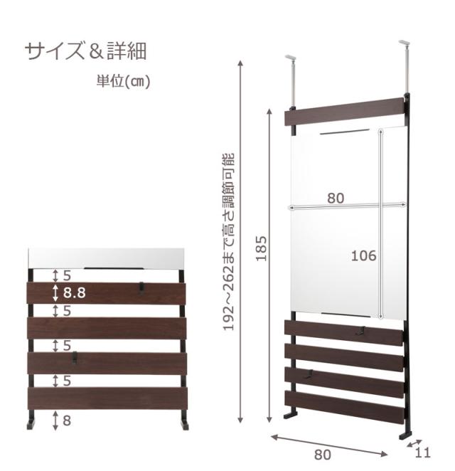 サイズ:本体:約幅80×奥行9(脚部11)×高さ192〜262cm