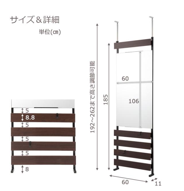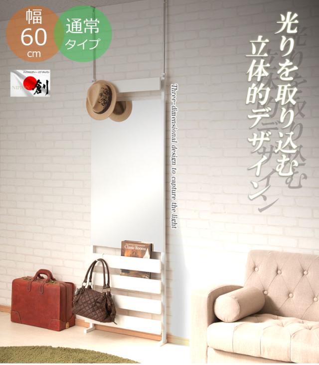 BORDER ボーダー 突っ張り立体ミラーラック 幅60cm 通常タイプ (突っ張り 壁面収納 仕切り パーテーション リビング 鏡 姿見)