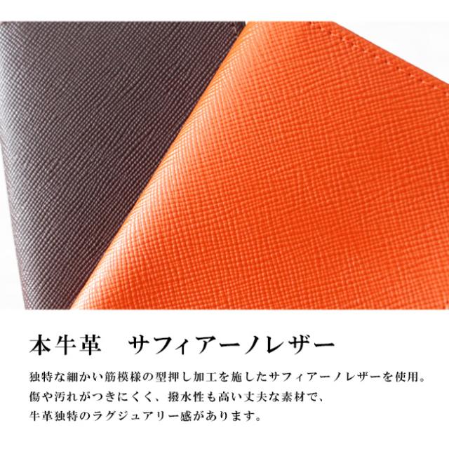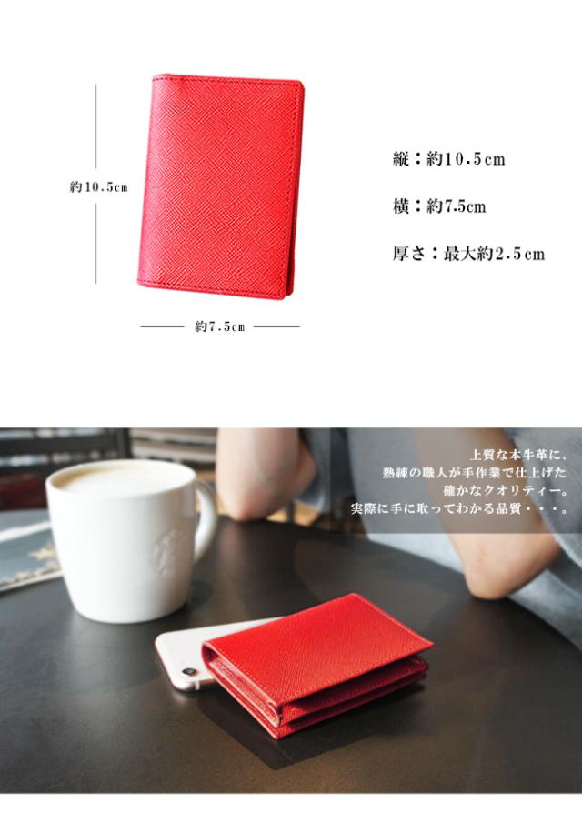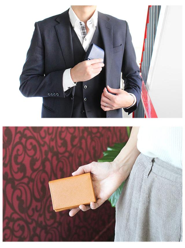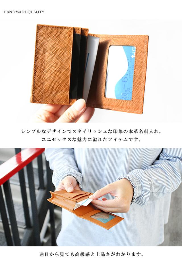 独特な細かい筋模様の型押し加工を施したサフィアーノレザーを使用した名刺入れです。傷や汚れがつきにくく、撥水性も高い丈夫な素材で、牛革独特のラグジュアリー感があります。名刺収納、カード入れとシンプルな収納で、窓付きのカードホルダーが定期や免許証などの収納に便利です。