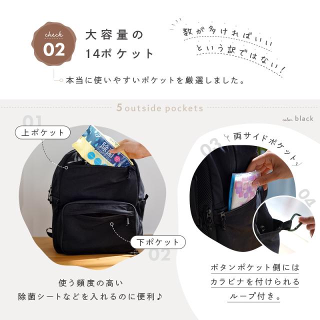 使いやすさを考えた14つのポケットと、