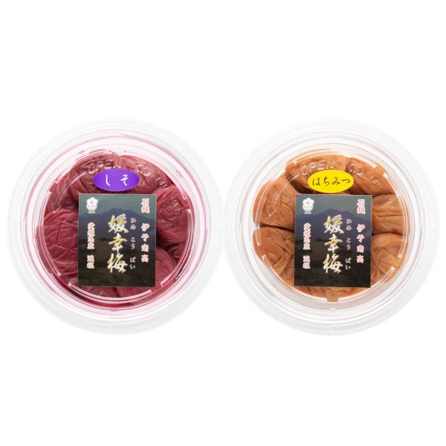 【まろやかな味わいのはちみつ梅干と昔ながらのしそ漬の梅干セット】30年前から伊予南高梅を栽培してきた梅農園、佐伯食品が生産・加工・販売までの一貫体制でお届けする、「しそ」と「はちみつ」梅干しを組み合わせた『媛幸梅 うめちゃんセット』です。愛媛県東予地方にそびえる西日本最高峰標高1982mの石鎚山の麓に広がる西条市。この地で栽培されている伊予南高梅は、大粒で皮が薄く、香りと糖度も高いことから、蜜柑とならぶ特産品となっています。