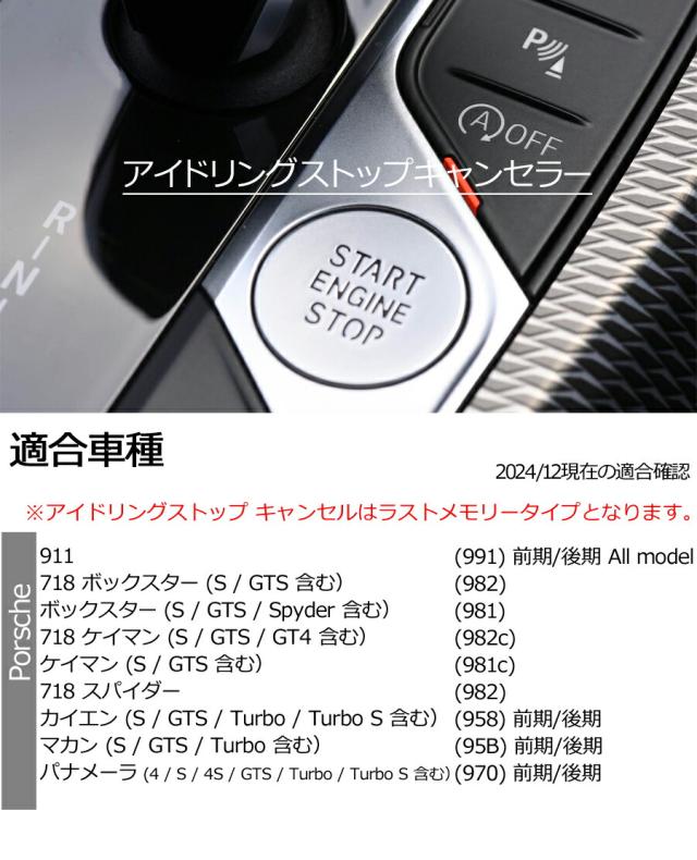 ![]() ![]() ![]() ![]() ![]() アイドリングストップがキャンセルされた状態になります。車種によってエンジンを切る直前のアイドリングストップの状 態を記憶するラストメモリータイプもしくはアイドリングストップを強制的に off※1 にします。 技術的な作業は一切必要無く、車両の obd2 ポートに差し込むだけ。ランプがグリーン点滅からイエロー点灯になったら完了です。 元に戻したい場合は再度挿入するだけ。今度はグリーン点滅からブルー点灯になったら完了です。 本製品の内部に dip スイッチを内蔵し、リカバリーモードを搭載しております。万が一の際に対して本製品を挿す前の車両状態に戻す事が出来る機能です。 ![]() --------------------------------------- <適合> Porscheポルシェ ・911(991) 前期/後期 All model ・718 Boxster ・Boxster S・Boxster GTS(982) ・Boxster(981) Boxster・Boxster S・Boxster GTS・Boxster Spyder ・718 Cayman ・Cayman S・Cayman GTS・Cayman GT4(982c) ・Cayman(981c) Cayman・Cayman S・Cayman GTS ・718 Spyder (982) ・Cayenne(958) 前期/後期 Cayenne・Cayenne S・Cayenne GTS・Cayenne Turbo・Cayenne Turbo S ・Macan (95B) 前期/後期 Macan・Macan S・Macan GTS・Macan Turbo ・Panamera(970) 前期/後期 Panamera・Panamera 4・Panamera S・Panamera 4S・Panamera GTS・Panamera Turbo・Panamera Turbo S --------------------------------------- ※アイドリングストップ キャンセルはラストメモリータイプとなります。 ※・911(992) ・Cayenne (PO536) ・Cayenne Coup? (PO536) ・Panamera(971) には、PLUG connect.ISC for Porscheが適合となります。 ※ご注意: ev・プラグインハイブリット・ハイブリット除くアイドリングストップ機能装着車に適合します ※リカバリーモードについて: 本製品をインストールする前の車両状態に戻す事が出来る機能です。 ●あらたに追加された車種やソフトウェアのアップデート等がありますので、購入される前に販売店へ適合をご確認下さい。 ●本製品は車両の車体番号にて管理しています。別の車両には使用出来ません。 ●本製品を購入後1年以内に車両ソフトウェアがバージョンアップした場合、対応出来次第無償にて製品のソフトウエアをアップデートさせていただきます。尚、ソフトウェアのアップデートサービスが終了した製品につきましては購入後1年以内でも保障対象外とさせていただきます。 ※本製品の適合している車両でも、予告なく変更された車両仕様により本製品をインストールができない場合があります。それに伴う発生した工賃・部品などの費用はお客様のご負担となります。 ●本製品はコーディング変更や他社の製品による同等の変更に対して使用すると、正常にインストール出来ない場合がありますので併用しないでください。保証対象外となります。 ●製品はご購入日より1年保証となります。