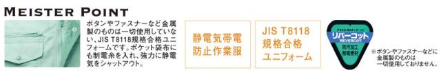 ボタンやファスナーなど金属製のものは一切使用していない「JIS T8118規格合格」ユニフォームです。ポケット袋布にも制電糸を入れ、強力に静電気をシャットアウトします。