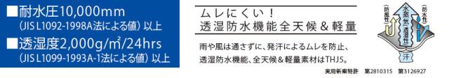 雨や風は通さずに発汗によるムレを防止、透湿防水機能、全天候&軽量素材はTHJ5