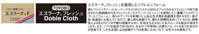 表にファインデニールスーパーブライトポリエステル60%とアメリカのカリフォルニア州で産出された高級綿40%をブレンドした『エスラーナフレッシュ』を使用した二重織ツイルの「ソフトユニフォーム」。滑らかでソフトな肌触りと上品な光沢感が高級感を漂わせます。吸汗性・保温性にも富んでいるので、着心地も抜群です。優れた制電性を持っているため、静電気によるまとわりつきや塵の吸着が少なく、毛羽立ちも少ないためスムースな風合が長持ちします。また、ソフトな風合でありながら、なおかつ中厚地に必要なハリ、コシもあり丈夫なのも特長です。しかも洗濯による収縮やシワは非常に少ないので、お手入れも簡単です。