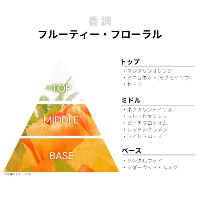 マンダリン・オレンジ、ミニョネット(モクセイソウ)、セージなどが、凛としたシトラス・ハーバルを香り立たせるトップから、