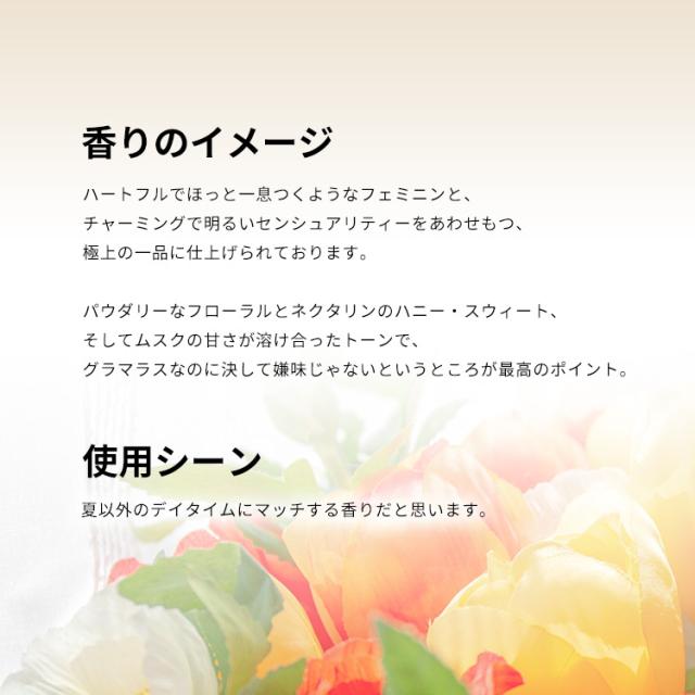 調香は、ブルガリの「プチママン」やショパールの「ウィッシュ」、ジル・サンダーの「ピュア」などの傑作で有名なナサリー・ローソンです。パウダリーなフローラルとネクタリンのハニー・スウィート、そしてムスクの甘さが溶け合ったトーンで、グラマラスなのに決して嫌味じゃないというところが最高のポイント。夏以外のデイタイムにマッチする香りだと思います。