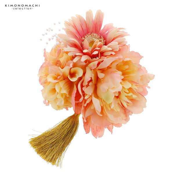 【カラー】明るいオレンジ色系の濃淡のある牡丹の造花。淡い赤みの黄色のダリア、ピンクのぼかしのガーベラ。小さなパールの飾り。つやのあるマスタードのタッセル。