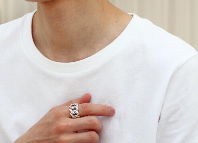 喜平チェーンを模したデザインのリング。少しエッジが効いていて、男らしさを感じます。パット目を引くこのリング、コーデのアクセントになること間違いなしです。