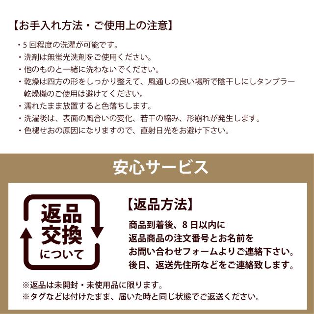 ・本商品はご家庭の洗濯機で丸洗いすることができます。必ず洗濯ネットを使用して陰干ししてください。