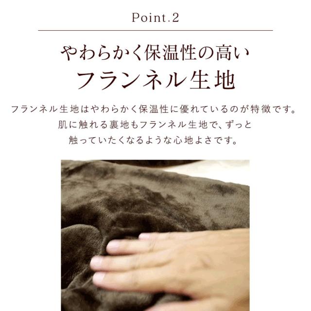 こちらの商品には柔らかく保温性に優れているフランネル生地を表地だけでなく、肌に触れる裏地にも使用しているので暖かく快適にご使用いただけます。