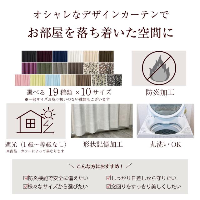カーテン ドレープ 厚地 防炎 1級遮光 2級遮光 遮光 形状記憶 洗える 清潔 ウォッシャブル オシャレ 高級感 無地 花柄 2枚セット 1枚入り サイズ豊富 ジール アール ダリア パルク ヴィーナス