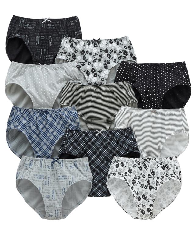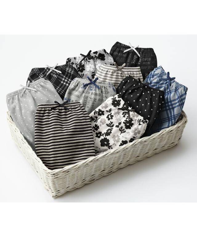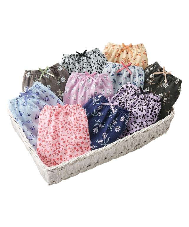 豊富な色柄から選べる、肌にうれしい綿100%のレギュラー丈のショーツ10枚組。ウエストと脚口のゴムが肌に直接あたらないくるみ仕様もなので、肌側は綿100%になります。色柄違いの10枚組なので毎日違うデザインが楽しめます。アウターのボトムからのぞきにくいレギュラー丈です。※商品の色移りを防止するために個包装を行っている場合がございます。個包装はプラスティック削減のため一部の色のみに使用しています。